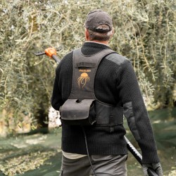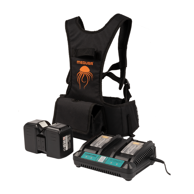 El vareador de peina MEDUSA está disponible con barra fija y telescópica (modelo PPM-10T) y puede alimentarse con una batería de automóvil o con un kit de 2 baterías de litio de 18 V y 9 Ah. La conexión de la máquina al kit de baterías se realiza mediante un conector super resistente de tipo militar. Además, este kit incluye un arnés ergonómico de sujeción en la espalda, con espacio suficiente para llevar las baterías necesarias.
