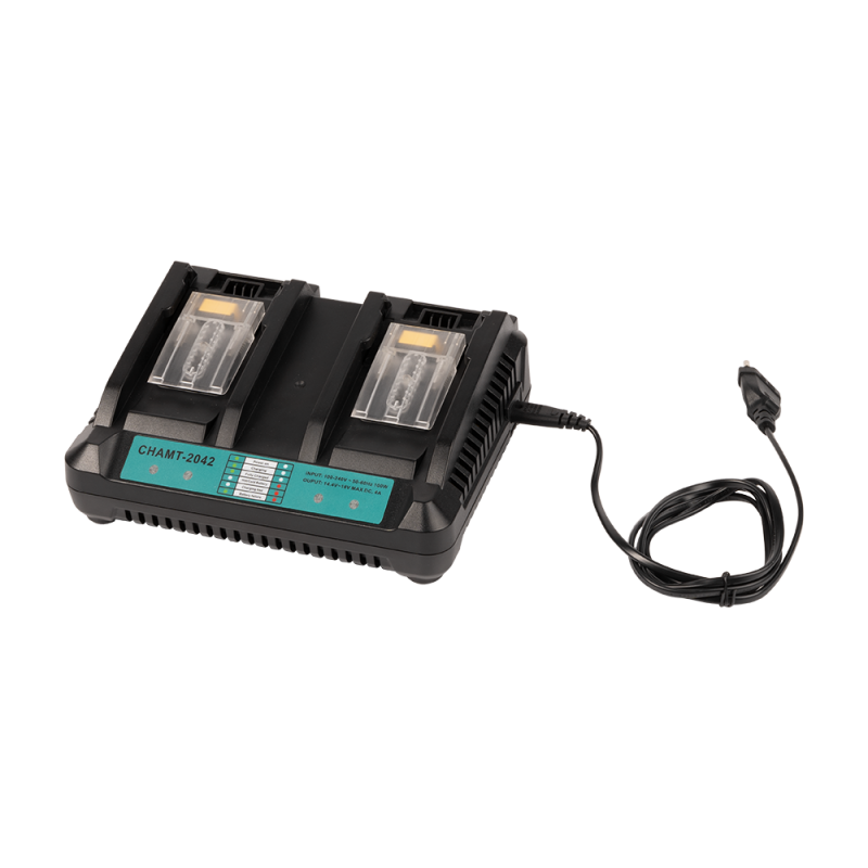 Cargador rápido con 2 puertos que permite la carga simultanea de 2 baterías de litio 18V 9A.